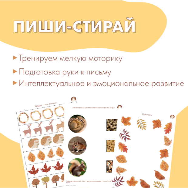 Всего в сборнике 59 листов на тему осени в формате PDF. Их можно просто распечатать или заламинировать и скрепить в папку. Используя водный маркет, выполнять задания повторно много раз, просто стирая маркет влажно салфеткой или губкой.